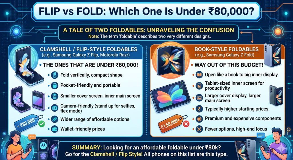 - Clamshell / flip-style foldables fold vertically like the old flip phones. Think Motorola Razr or Samsung Z Flip. These are the ones that actually fit under ₹80,000.