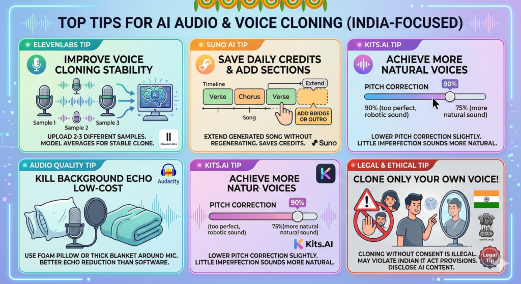 Legal tip: Only clone your own voice. Using this workflow to clone someone else’s voice without consent is a privacy violation and potentially illegal under Indian IT Act provisions. Always disclose AI-generated content where required.