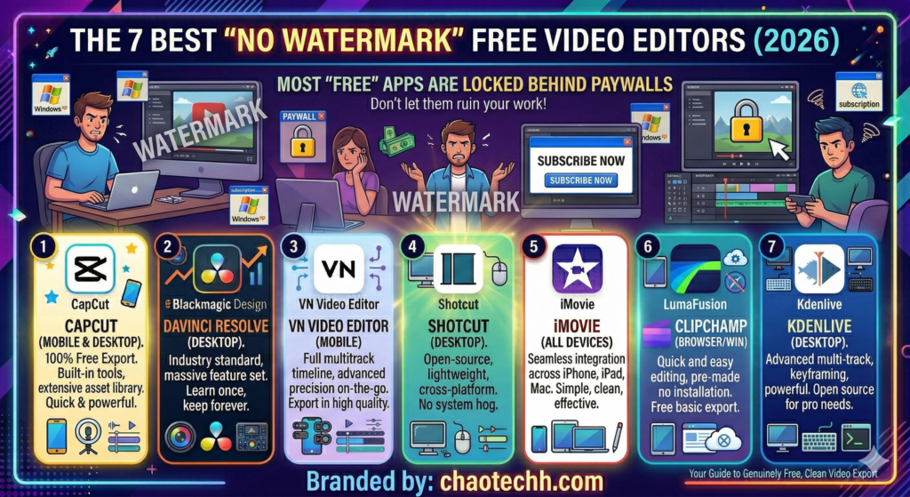 The watermark problem is real โ and it’s designed to push you toward a subscription. But in 2026, you genuinely don’t have to pay to edit clean, professional-looking videos. The tools above prove that. Start with CapCut or DaVinci Resolve depending on your device, and you’ll be exporting watermark-free content before the end of the week.