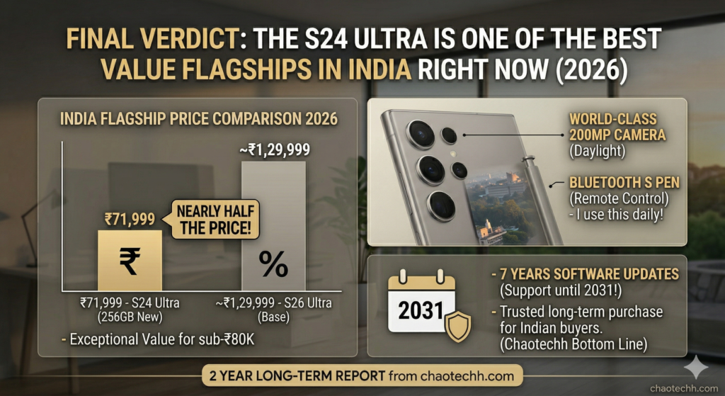 The S26 Ultra is a better phone in specific ways: faster charging, a lighter design, a stronger chip with better on-device AI, and that clever Privacy Display. If you have ₹1.3 lakh to spend and want the absolute latest, go for it. But if you’re in India, making a considered purchase decision at the ₹72,000–₹84,000 mark, the S24 Ultra is not a compromise. It is a deliberate choice — and a very smart one.