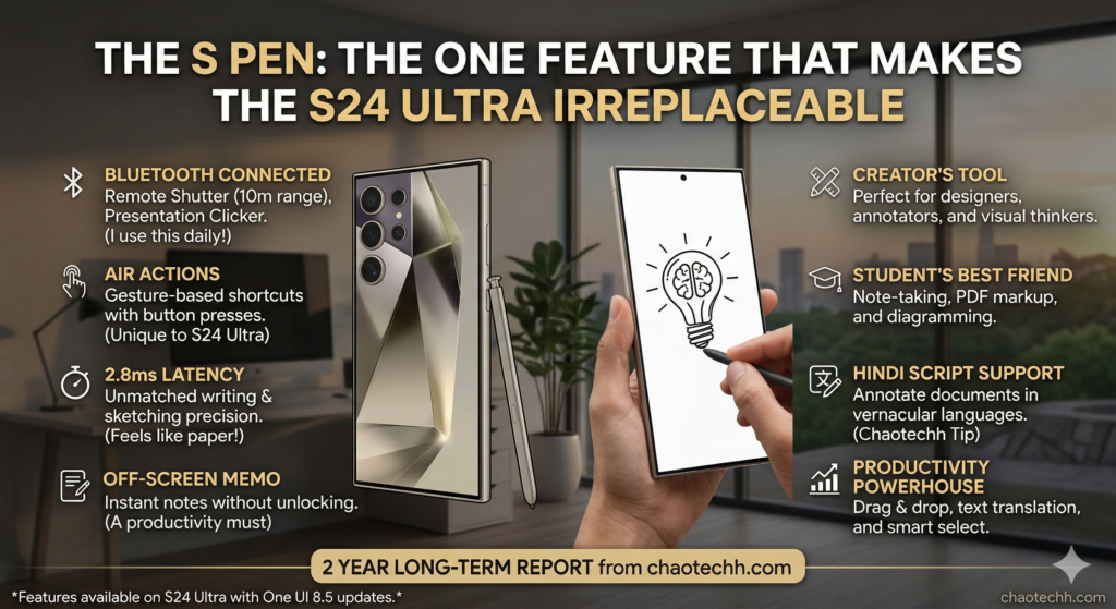 Here’s the elephant in the room that no one is talking about loudly enough: the S24 Ultra is the last Samsung phone with a Bluetooth S Pen. The S25 Ultra removed Bluetooth. The S26 Ultra kept it removed.